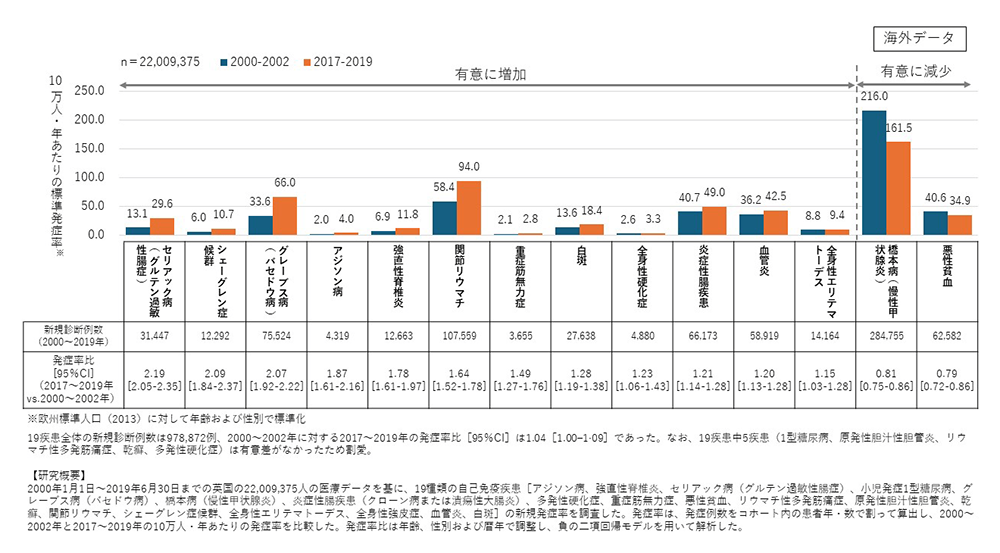 2023年、英国から自己免疫疾患に関する大規模コホート研究の結果が報告された1)。2000~2019年までの約2,200万人の医療データを基に、19種類の自己免疫疾患の発症率や有病率、併発率などを調べた調査である。20年間で発症率が有意に増加していたのは19疾患中12疾患(図1)。なかでもセリアック病(グルテン過敏性腸症)、シェーグレン症候群、グレーブス病(バセドウ病)は2倍以上、有意にリスクが増加していた。19疾患全体で新規患者数は4%増え、有病率は人口の10.2%であった。さらにこの調査では、疾患によって発症率に社会経済的格差や地域差がみられたものもあり、環境が何らかの影響を及ぼしている可能性も指摘されている。