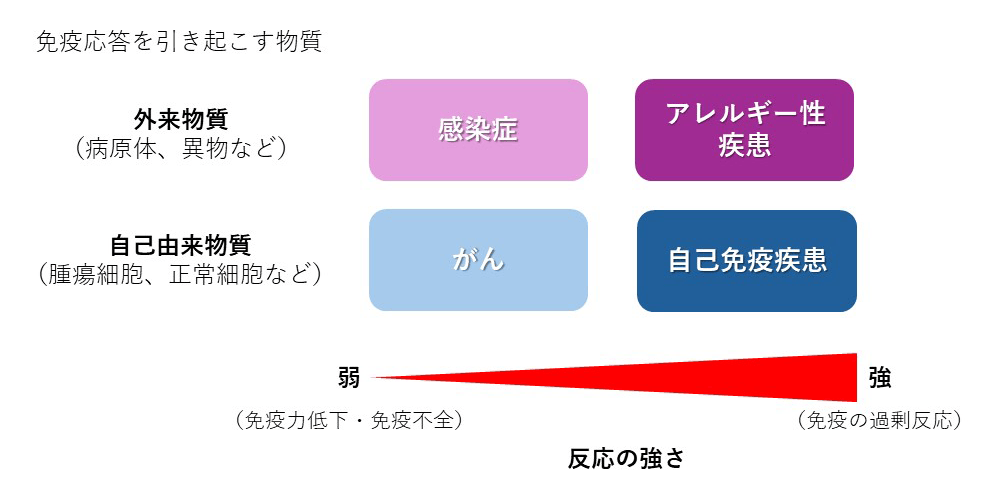 免疫の異常が関わる疾患は数多くあるが、免疫応答の観点からみると、感染症やがんが免疫機能の低下あるいは免疫不全がもたらす病態であるのに対し、アレルギー性疾患や自己免疫疾患は免疫の過剰反応がもたらす病態である(図2)2)。さらに、アレルギー性鼻炎や気管支喘息などのいわゆるアレルギー性疾患では花粉や食品、化学物質などの外来抗原(アレルゲン)に反応を示すのに対し、自己免疫疾患では自己の正常細胞(自己抗原)に反応を示す。いずれも過度の反応を起こせば組織に炎症が起き、臓器や器官に障害を来す。そのため、アレルギーの重症例や自己免疫疾患の治療では免疫抑制剤が使われることも多いが、一方で免疫を抑えることにより、感染症やがんなどのリスクが高まる可能性もある。