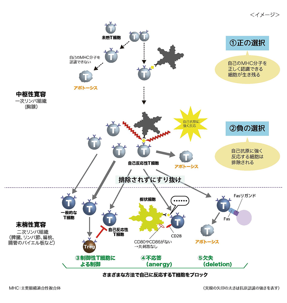 このほか、T細胞の表面にあるアポトーシスを誘導するたんぱく質(Fas)が、他の細胞のFasリガンドに結合してクローンが「欠失(deletion)」し、自らアポトーシスすることもある(図3-⑤)。