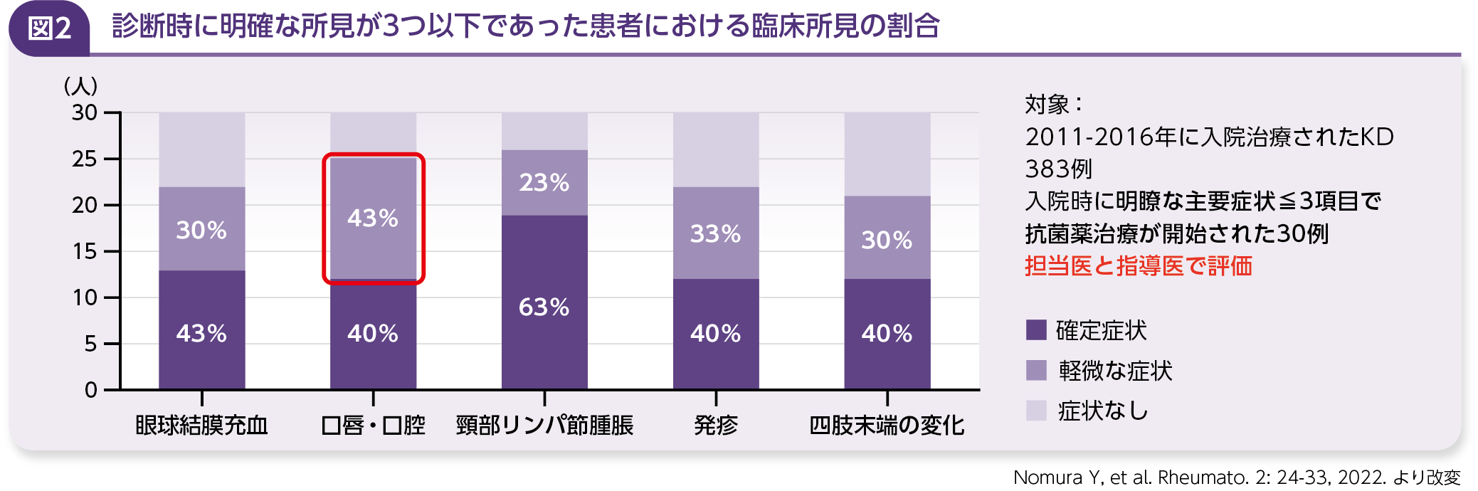 主要症状が少ない症例を見逃さないためには、①軽微な臨床症状を認識する、②複数の目で診る、③微妙な冠動脈所見を正確に評価する、④『川崎病診断の手引き改訂第6版』に記載されている参考条項を活用することが重要であると考えている。鹿児島県のデータ(2011~2016年)では、入院治療を受けた川崎病患者383例のうち、明確な主要症状が3項目以下で抗菌薬治療が初期に開始された30例を検討した結果、口唇・口腔所見が比較的見逃されやすいことが明らかになった5)(図2)。