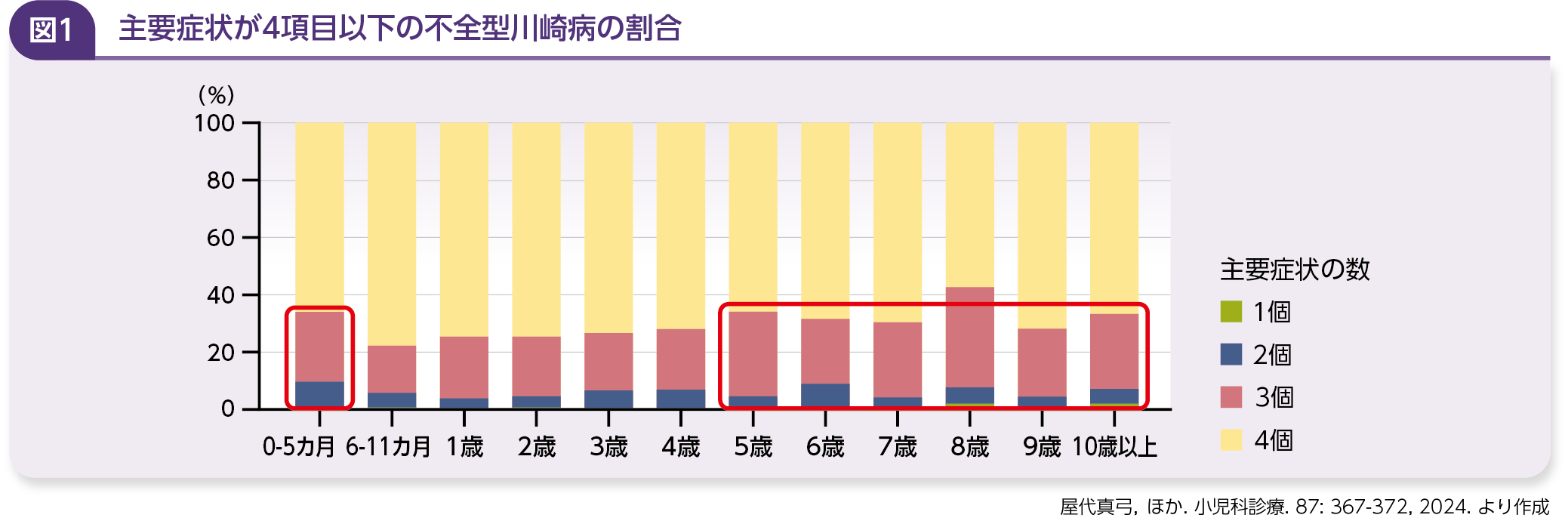 川崎病の診断は、主要症状が5項目、6項目ある場合は難しくない。しかし、主要症状が4項目以下の場合は、不全型川崎病についてしっかりと見極める目を養う必要がある。第27回川崎病全国疫学調査のデータによると、不全型の主要症状4項目以下の割合を見ると、乳幼児早期(0~5カ月)と5歳以上で主要症状が3項目以下の症例が多く、診断・鑑別に悩む事例が多いことが判明している1)(図1)。