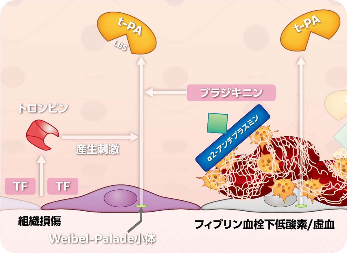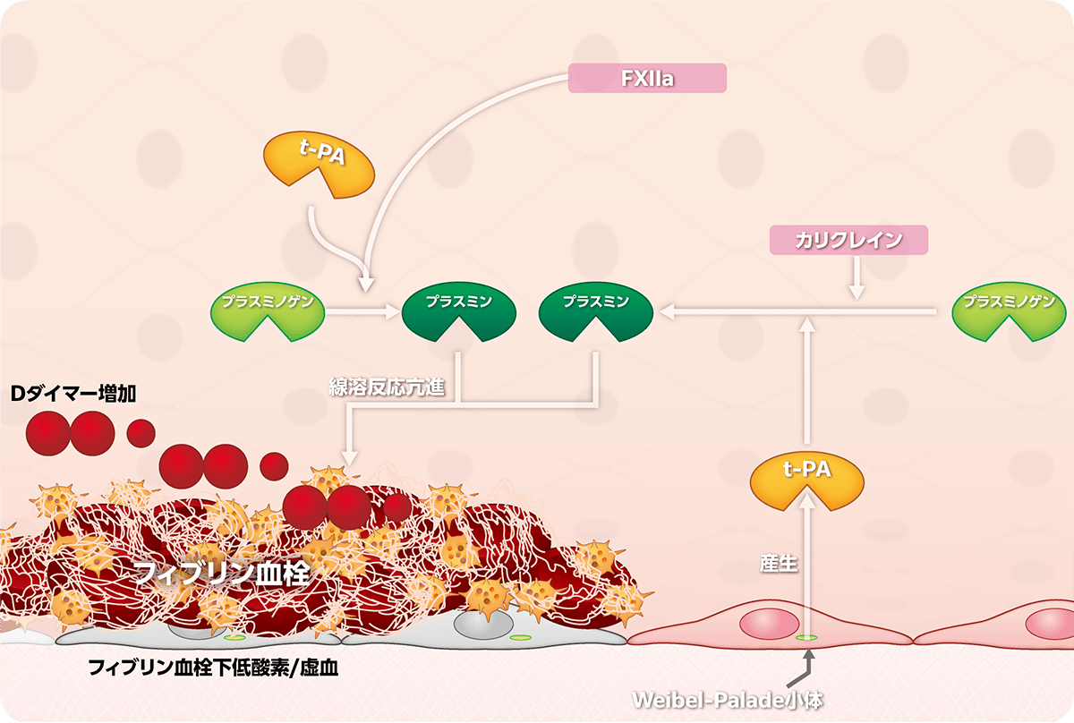 組織型プラスミノゲンアクチベータ。プラスミノゲンを活性化する線溶系の開始因子。 、FXIIa、カリクレインがプラスミノゲンをプラスミンに変換。 - プラスミンがフィブリン血栓を溶解。