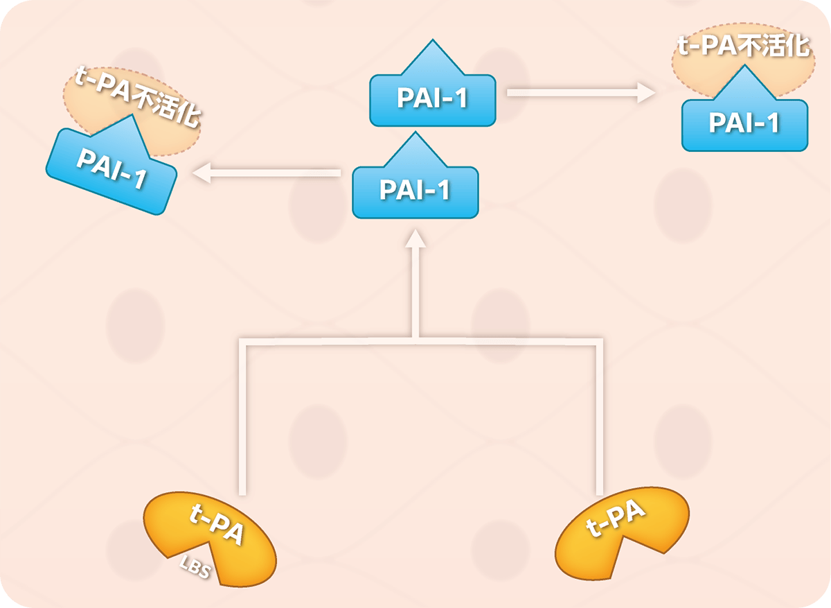 - t-PAと複合体(t-PA/PAI-1複合体)を形成してt-PAを不活化。