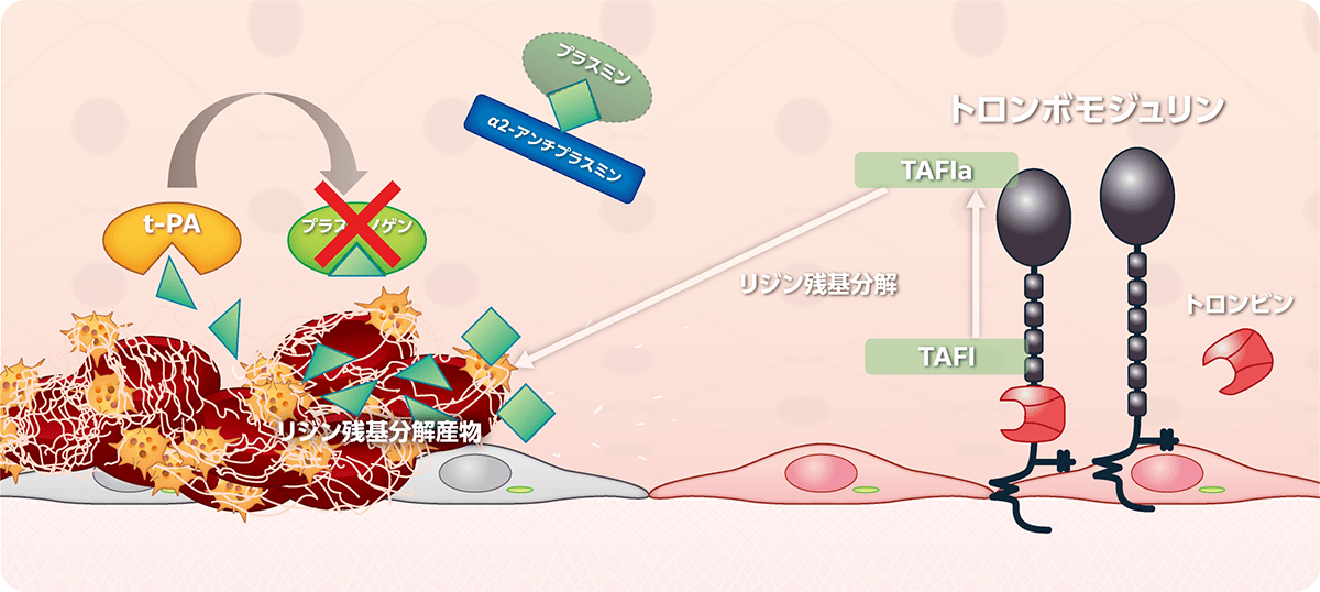 活性化TAFI。フィブリンのリジン残基に結合してプラスミン産生を阻害する。 がフィブリンのリジン残基を分解。 t-PAと プラスミノゲン