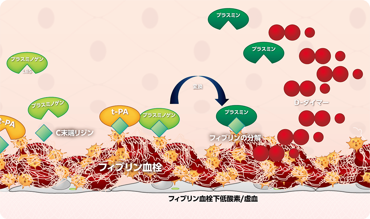 フィブリン血栓依存性に産生されたプラスミンがフィブリンを分解する反応です。